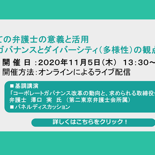 そこで、今般,経済産業省「CGS研究会」(コーポレート・ガバナンス・システム研究会)委員でもある澤口実弁護士による基調講演と、同弁護士及び当地区の上場会社役員等をパネリストとする実務経験に基づいたパネルディスカッションを通じて,当地区企業のコーポレートガバナンス意識の一層の向上と社外役員候補者名簿の活用を目指して、令和2年11月5日(木)、オンライン配信にて社外役員シンポジウムを開催いたします。是非お気軽にご参加ください。