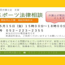 先月政府が発令した緊急事態宣言も延長となり、ますますお困りのスポーツ関係者の方も多いことと思います。そこで、当初7月に開催を予定しておりました本年度スポーツ法律相談会を急遽早め、今月以下のとおり開催することといたしましたので、お知らせいたします。