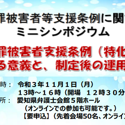 現在、愛知県では、犯罪被害者やその家族を支援するため、学識経験者や弁護士、民間支援・犯罪被害当事者団体等で構成する「愛知県犯罪被害者等の支援に関する有識者会議」を設置して「愛知県犯罪被害者等支援条例(仮称)」の制定に向けた検討が進められています。今般、「愛知県犯罪被害者等支援条例(仮称)骨子案」が取りまとめられ、県民意見提出制度(パブリック・コメント制度)に基づき、県民からの意見を募集がされる等、制定に向けた動きが進められています。