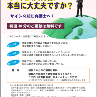 本制度では、「海外企業との取引にあたって締結する契約書」、「海外展開に伴う現地におけるトラブル予防法」、「契約中の海外企業とのトラブルの対処法」など多岐に渡ったご相談を受け付けております。