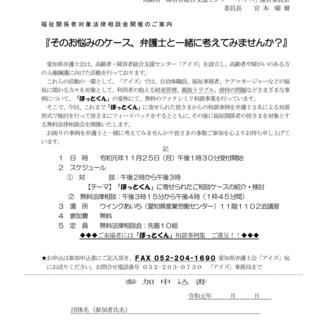 今回,これまで「ほっとくん」に寄せられた相談事例を弁護士2名の対談形式で検討を行い、皆様にフィードバックするとともに、その後福祉関係者の皆様を対象とする無料法律相談会を開催します。