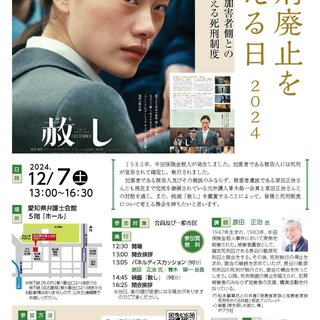 本事件の加害者である被告人を弁護した青木榮一会員と、被害者の実兄である原田正治さんとの対話を通じ、また、映画「赦し」を鑑賞することによって、皆様と死刑制度について考える機会を持ちたいと思います。