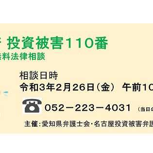 これを受け,愛知においても,愛知県弁護士会及び名古屋投資被害弁護士研究会との共催にて,下記のとおり110番を実施することになりました。