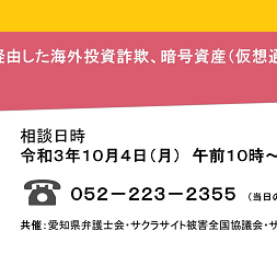そこで,10月4日に、愛知県弁護士会・サクラサイト被害全国協議会・サクラサイト被害弁護団愛知の共催で,『SNS・アプリ等を経由した海外投資詐欺,暗号資産(仮想通貨)詐欺被害全国一斉110番』を下記の要領で実施することとなりましたのでご案内します。
