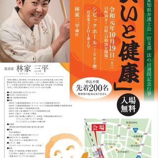 法の日週間記念行事として,落語家の 林家三平 師匠 を招き,「笑いと健康」をテーマに講演会を実施します。